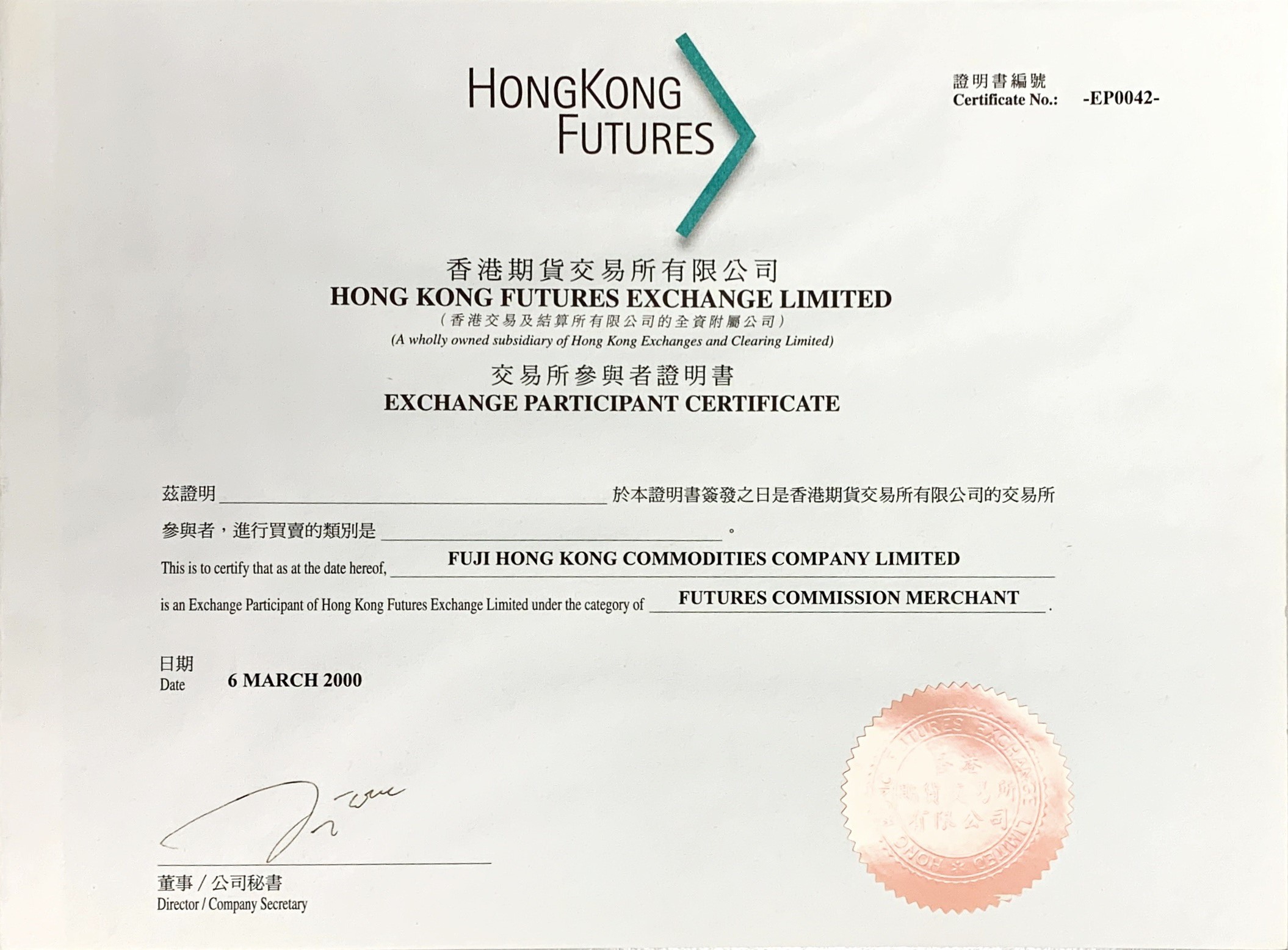 香港期货结算有限公司 结算参与者证书 2000年3月6日,香港联合交易所有限公司、香港期货交易所有限公司和香港中央结算有限公司完成合并,由单一控股公司香港交易及结算所有限公司(简称香港交易所或港交所,英语:Hong Kong Exchanges and Clearing Limited,缩写:HKEX)持有,合并后的香港交易所于2000年6月27日在联交所上市,股票代码 0388)。 富士商品获得由香港期货结算有限公司(香港期货交易所有限公司全资子公司)重新颁发的第41号『期货结算公司参与者证明书』,是最早一批成为香港期货结算参与者的持牌机构。 |