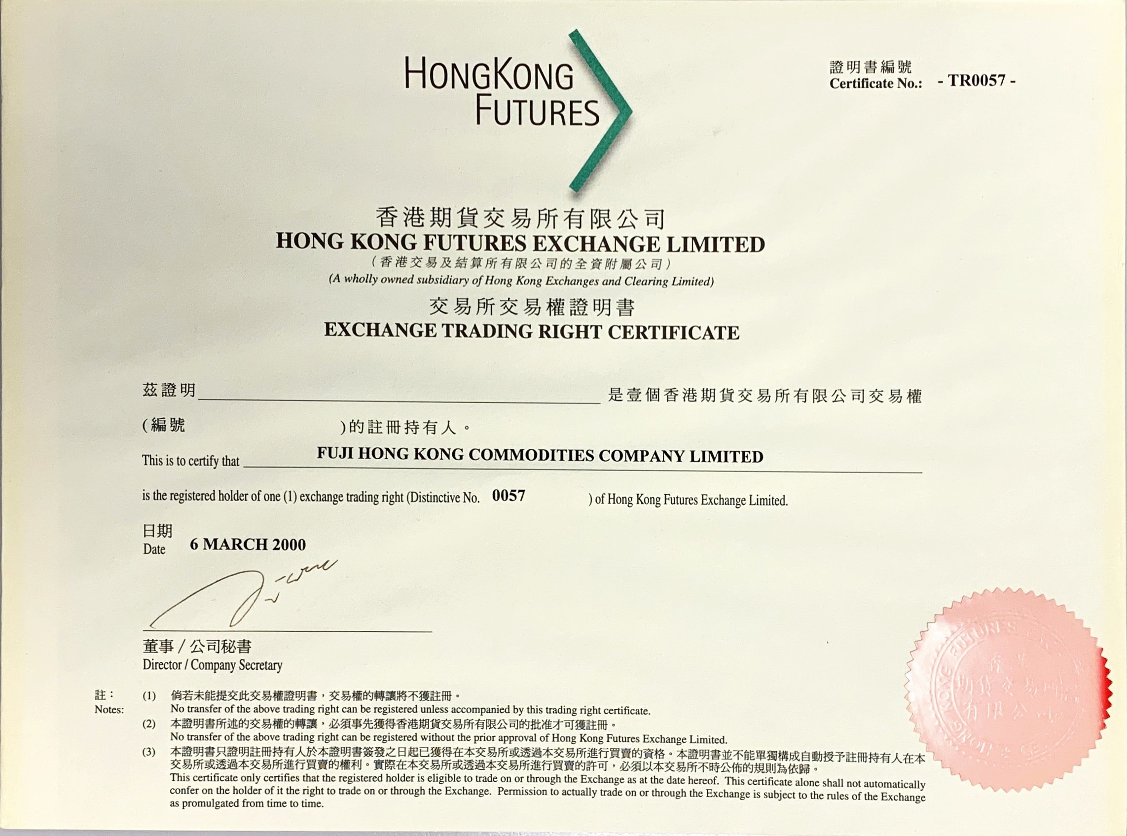 香港期货交易所有限公司 交易所交易权证书 2000年3月6日,香港联合交易所有限公司、香港期货交易所有限公司和香港中央结算有限公司完成合并,由单一控股公司香港交易及结算所有限公司(简称香港交易所或港交所,英语:Hong Kong Exchanges and Clearing Limited,缩写:HKEX)持有,合并后的香港交易所于2000年6月27日在联交所上市,股票代码 0388)。 富士商品获得由世纪大重组之后的香港期货交易所有限公司(香港交易所集团全资子公司)重新颁发的第57号『交易所交易权证明书』,是最早一批获得香港期交所交易权的持牌机构。 最新期交所会员已不再颁发『交易权证书』,与『交易参与者证书』合并。 |