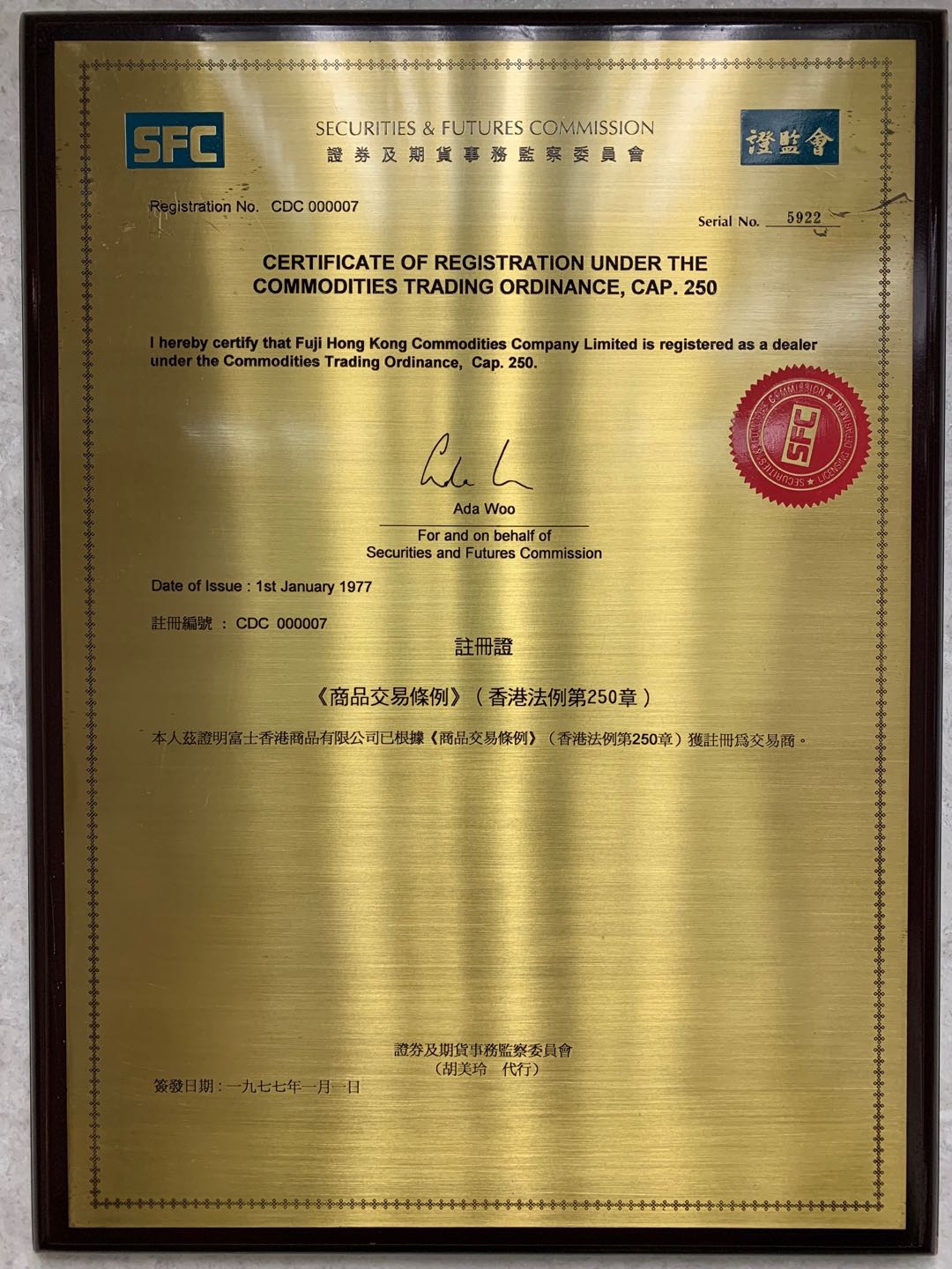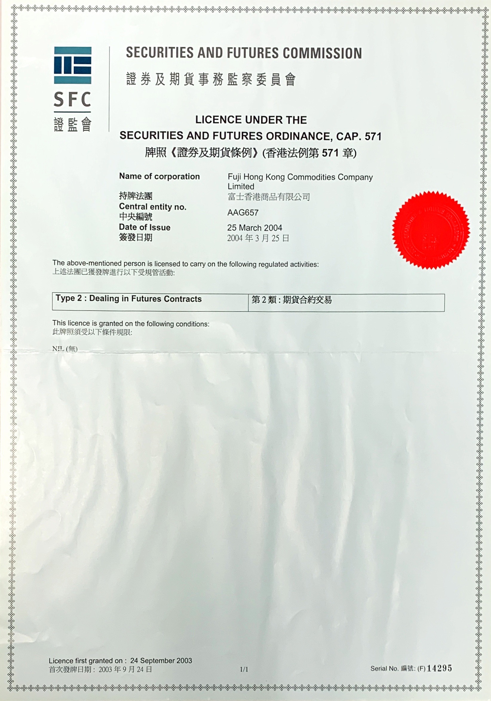香港期货结算有限公司 结算参与者证书 2000年3月6日,香港联合交易所有限公司、香港期货交易所有限公司和香港中央结算有限公司完成合并,由单一控股公司香港交易及结算所有限公司(简称香港交易所或港交所,英语:Hong Kong Exchanges and Clearing Limited,缩写:HKEX)持有,合并后的香港交易所于2000年6月27日在联交所上市,股票代码 0388)。 富士商品获得由香港期货结算有限公司(香港期货交易所有限公司全资子公司)重新颁发的第41号『期货结算公司参与者证明书』,是最早一批成为香港期货结算参与者的持牌机构。 |